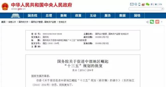 2016年12月23日,國務(wù)院下發(fā)《關(guān)于促進(jìn)中部地區(qū)崛起“十三五”規(guī)劃的批復(fù)》(國函〔2016〕204號(hào))。
